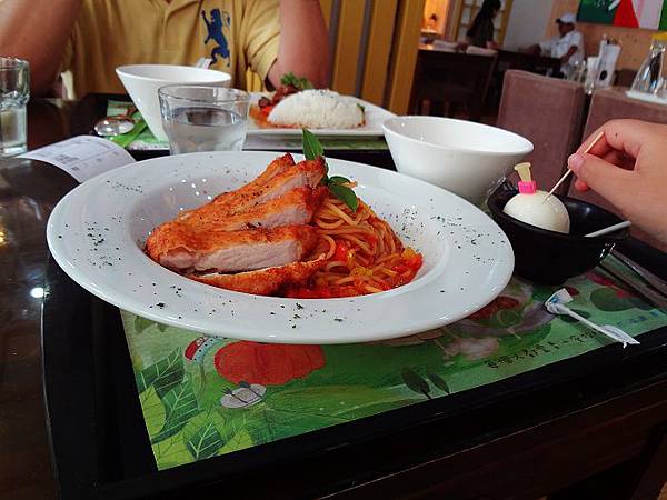 小皮的豬排義大利麵 旁邊圓球狀的是甜點~奶酪布丁, 被封在氣球般的塑膠套內,用牙籤刺破就會露出...很好玩!