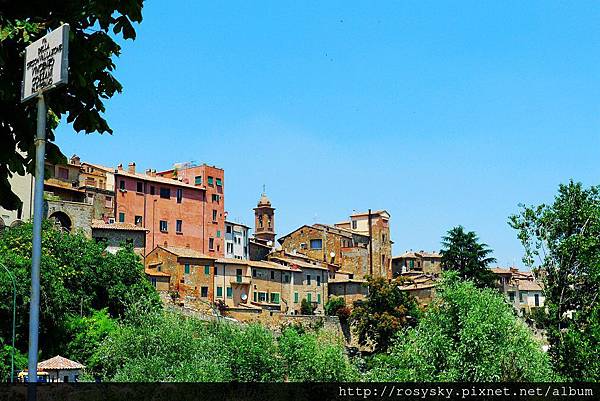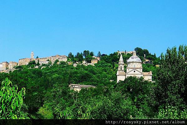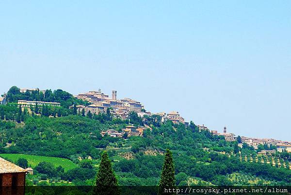 從路上遠拍小山頭上的蒙特普西安諾...這裡的山城因為戰略關係, 大都居高臨下, 現在保存良好的城牆, 在幾百年前都發揮了很大的防禦效果, 因為托斯卡尼各城鎮, 自古就必須在佛羅倫斯與西恩納兩個霸主中選邊站, 不想歸順就得奮力一搏, 所以戰事設施特別重要.