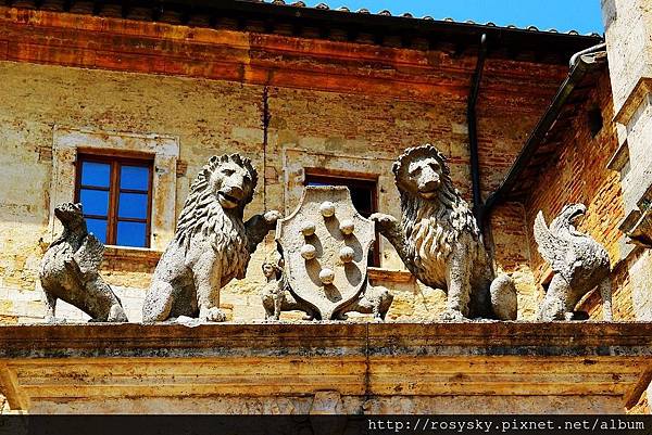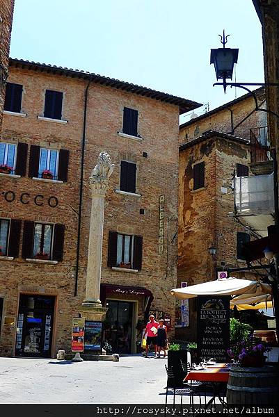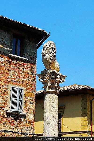石柱上本來是代表西恩納的母狼雕像, 後因西恩納被佛羅倫斯打敗, 故從1511年就換成代表佛羅倫斯的獅子