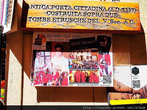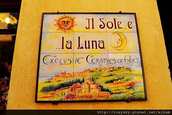 (太陽與月亮?)陶瓷藝品店的招牌, 下方有蒙特普西安諾與聖畢雅久教堂的圖畫, 我們後來到山下也找了處民宅街邊拍了張類似的照片