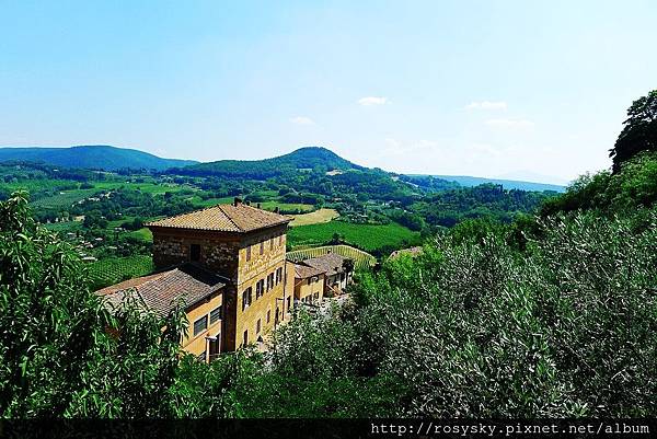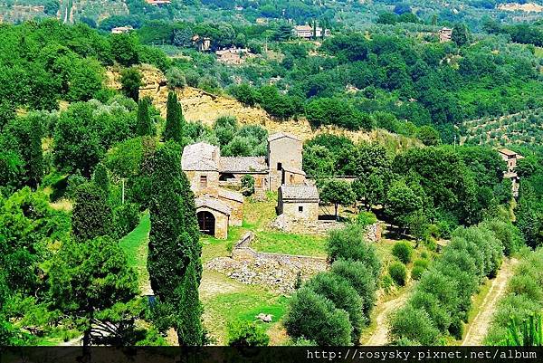 往山下看的風景, 綠油油的橄欖樹.絲柏及其他作物, 跟皮恩札的地形環境明顯不同